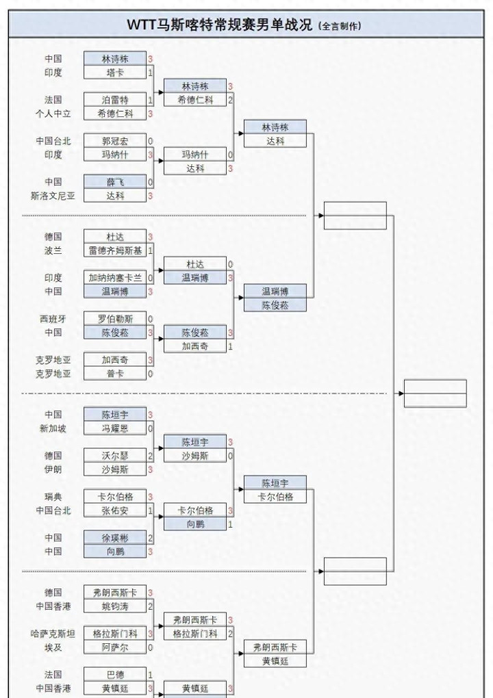 须眉单打比赛中,国乒共有14位选手参赛,最终有4东说念主投入8强,辩认是林诗栋,陈垣宇,温瑞博,陈俊菘。温瑞博将对阵陈俊菘,是详情4强限额的一场队内战,男单14东说念主中,林诗栋和陈垣宇实力最为隆起,可是林诗栋当今景色还不是最好,陈垣宇景色一般,但抽象实力稍逊一筹。这两场比赛就变得有更多变数。男单8强赛,另外2场比赛是香港选手黄镇廷对阵德国选手弗朗西斯卡,两东说念主皆是有实力的选手。