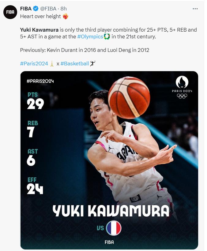 对阵法国一战河村33分钟,26中9,三分15中6,拿到29分7篮板6助攻1抢断仅2乌有,他成为奥运会历史上第三位拿到25+5+5的球员,另外两位是2012年的罗尔邓,2016年的杜兰特。