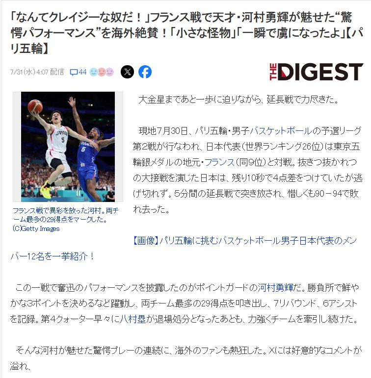 日媒《THE DIGEST》正式的记载了天下列国球迷对河村勇辉的评价:天才选手、5尺8的怪物、令人惊惧的饰演,没错这位23岁的小后卫让天下球迷亮眼。