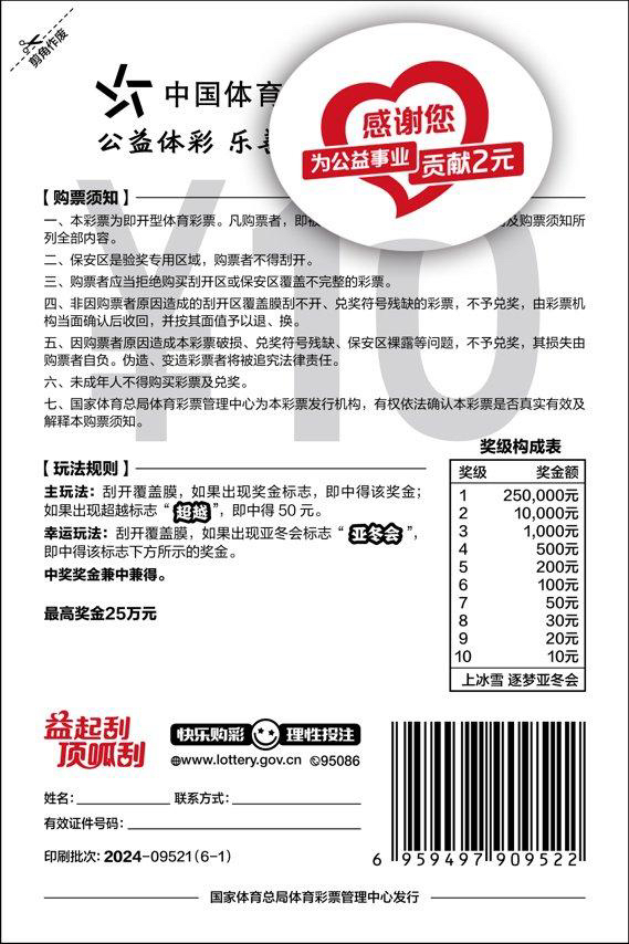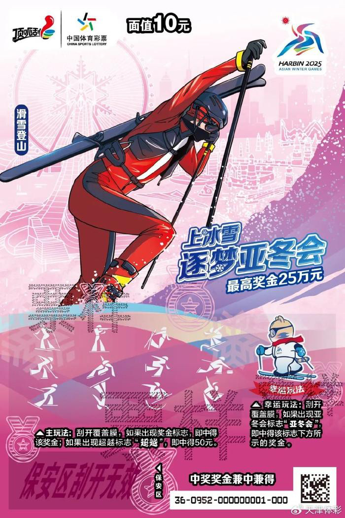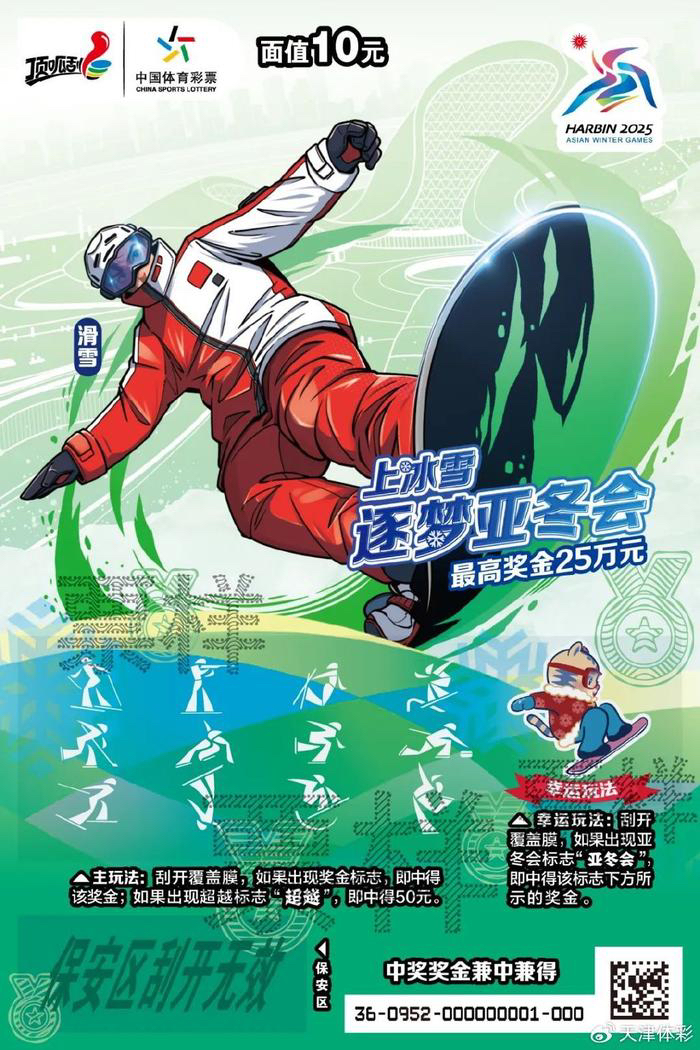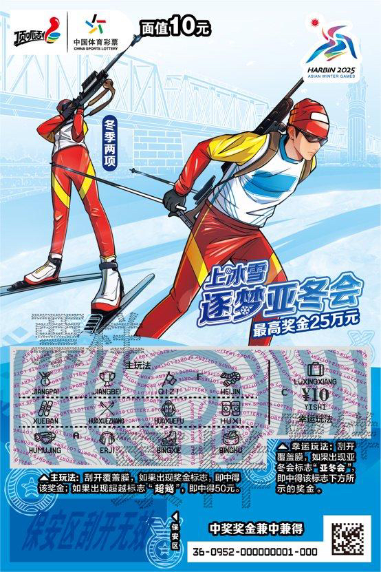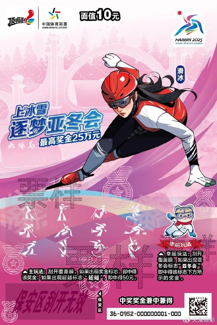 “上冰雪 逐梦亚冬会”,用票面展现冬季畅通的竞技魔力,传递努力拼搏、英勇直前的体育精神。体彩顶呱刮即开票,不单是是一张彩票,更是公益与梦念念的载体。每购买一张10元的“上冰雪 逐梦亚冬会”,就有2元公益金用于复古体育行状和社会公益行状,为更多东说念主送去但愿与和煦。购彩者在享受游戏带来乐趣的同期,也为社会奉献了一份爱心。