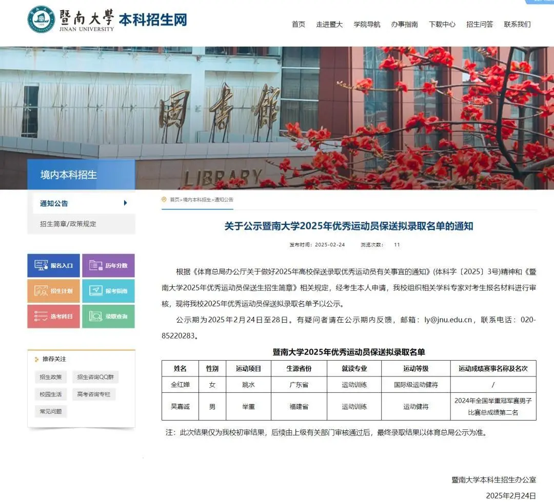 就在北京技艺2月24号这一天,暨南大学放了个大招,公示了2025年优秀分解员保送的拟登科名单,我们的奥运冠军全红婵大名显明在列。